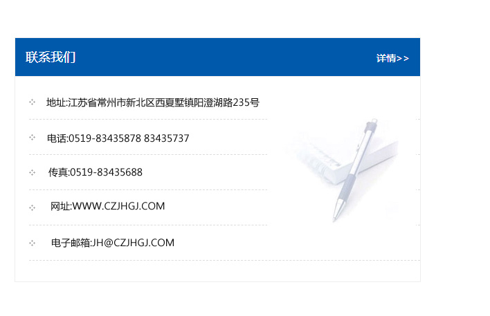 地址:常州市新北區友邦商務大廈1幢16、17層  電話:0519-85101652  傳真:0519-85112595  郵編:213022  網址:www.cz-jiayue_cn.hnzhisong.com  郵箱:xiajifengaa@163.com